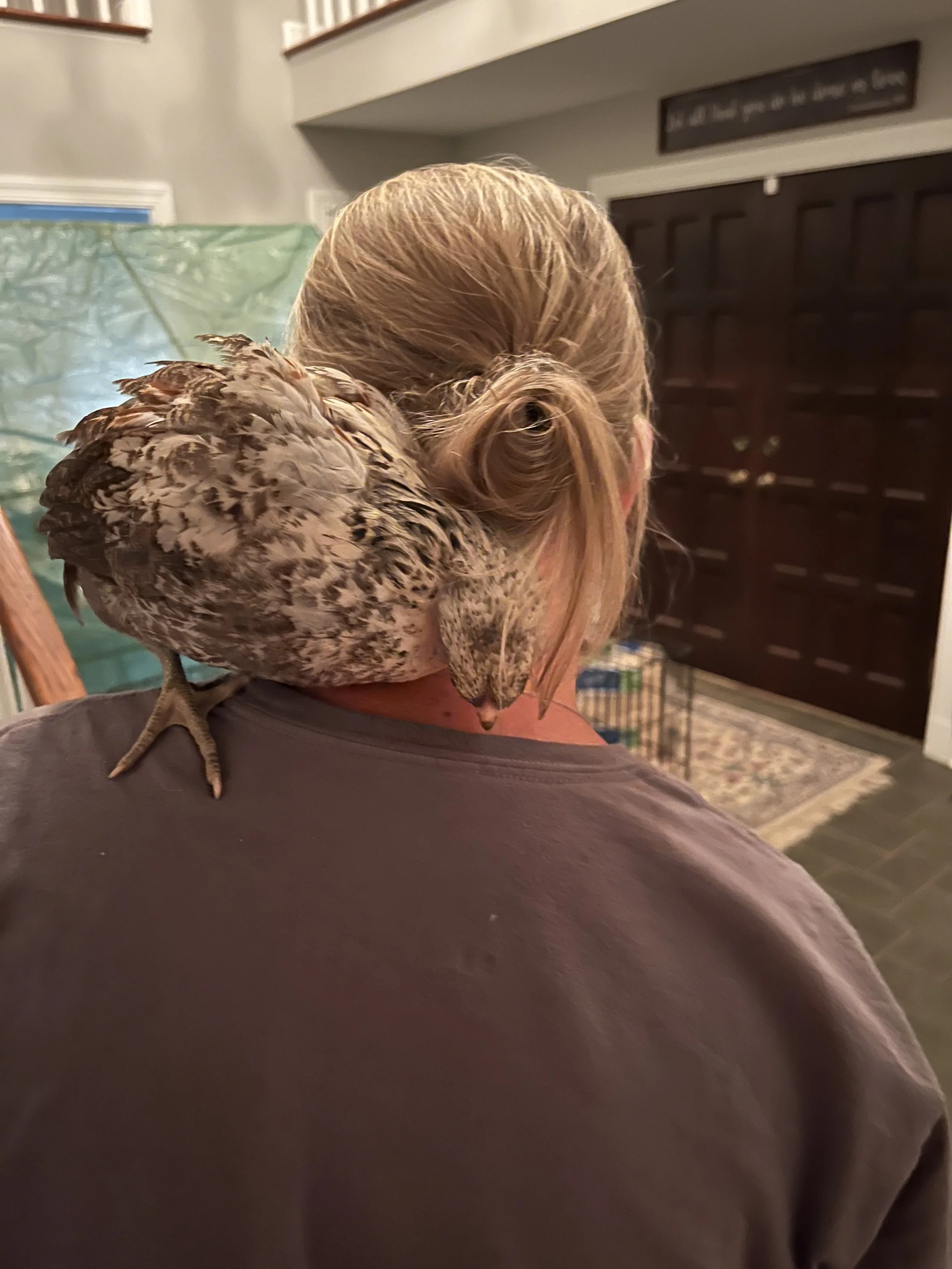 Poor MLC was teeny tiny. Her chick-mates were double her size. I started hand feeding her when I visited, but she was always hungry. One day, Neil showed me a picture he had taken of MLC with her head under a log in the run. She was hiding. My heart broke. I told Neil that nature is one thing, but I believe God gives humans empathy for a reason. He said, “My Little Chicken is moving in with us, isn’t she?”. Have I mentioned how much I love my husband? We set up an extra-large dog crate in the foyer and put pine shavings in the bottom. We added a roost, tiny chicken waterer, and a food tray and went out to the coop to get MLC.