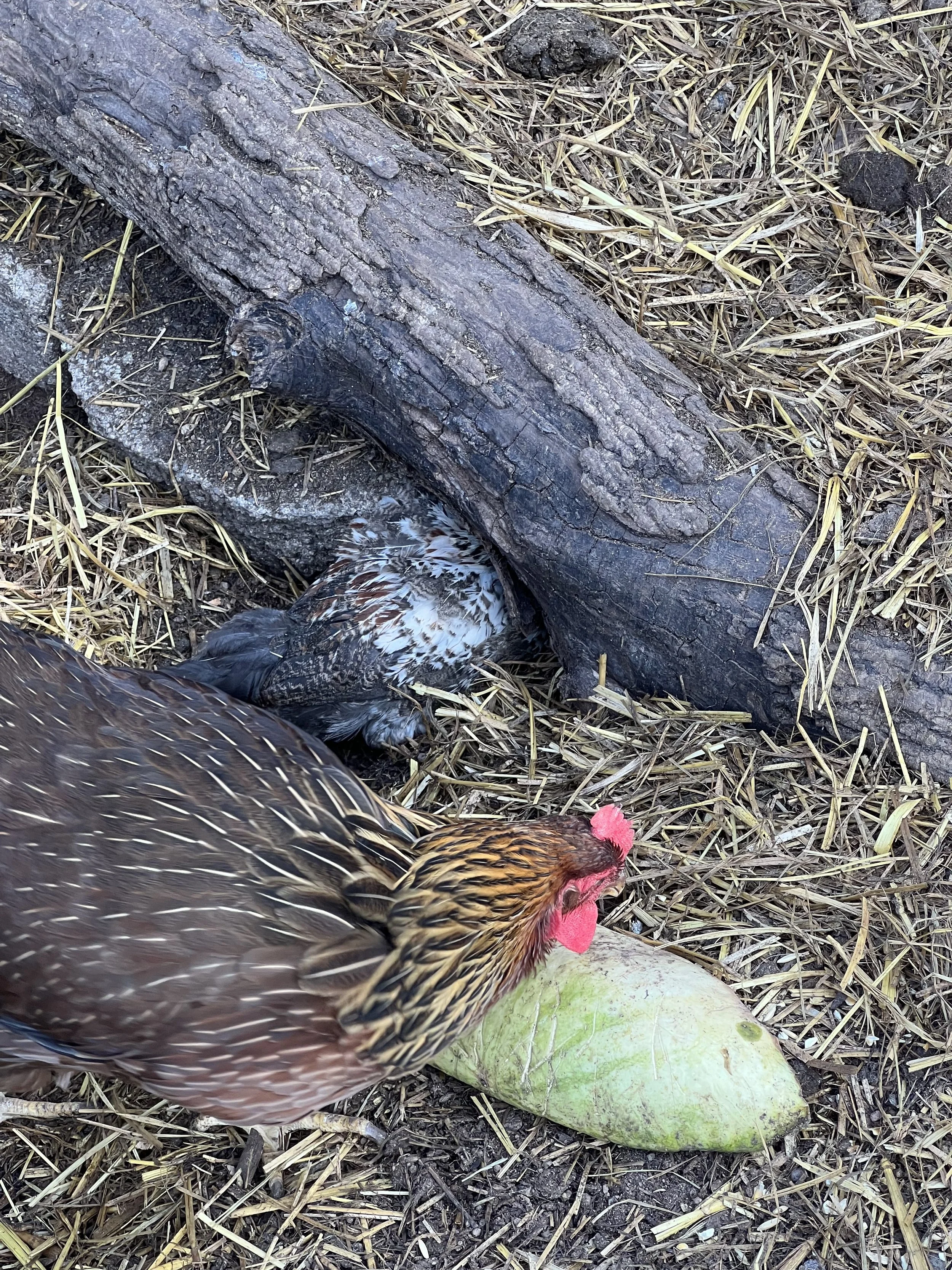 MLC trying to hide under the log (the chicken in the foreground is eating watermelon, not a green fish)